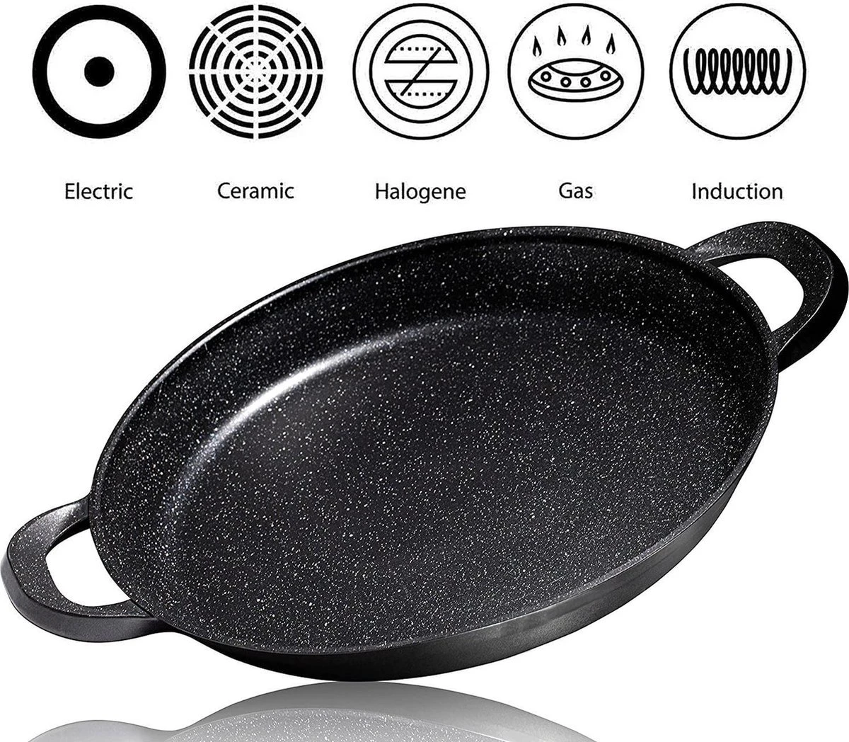CUILINA paella pan is geschikt voor alle warmtebronnen: Inductie, gas, elektrisch, open vuur, keramiek, kookplaat.