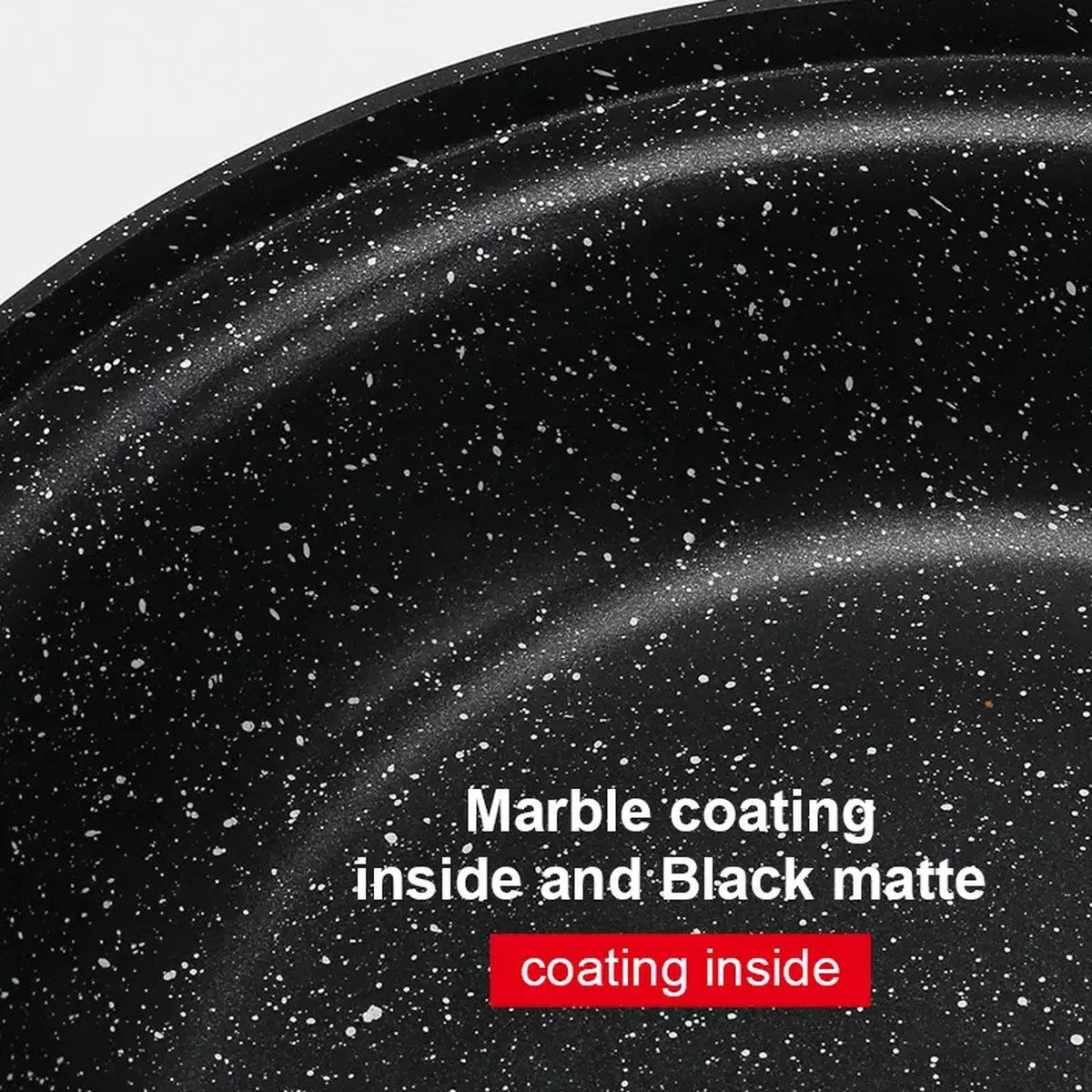 - Marble coating een antiaanbaklaag die ervoor zorgt dat er geen eten blijft plakken en dat er weinig of geen vet nodig is om er mee te koken.